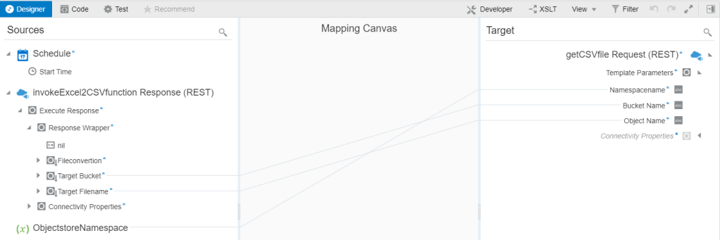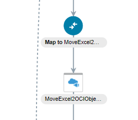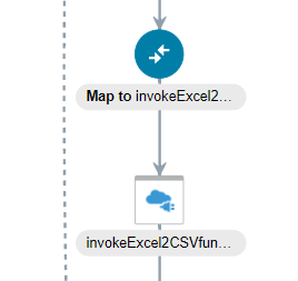 7. The getCSVfile step depicted here is responsible for retrieving the now converted CSV file from Object storage (as a binary file). As you can see from the below mapping, it retrieves the file based on the response of the Excel2CSV conversion function.
