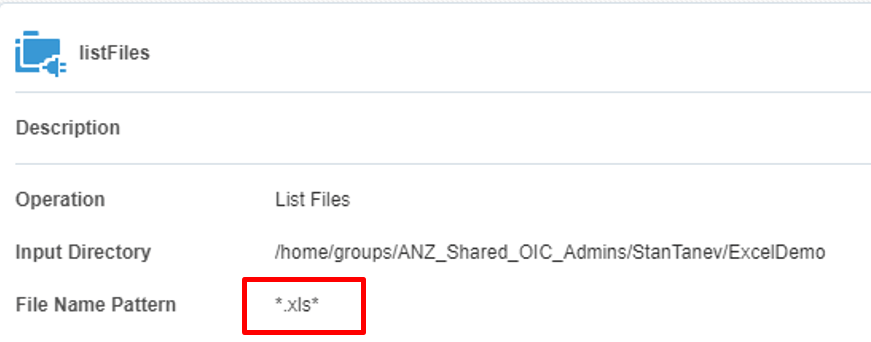 - The flow begins with an Excel file that resides on an FTP server (this can be any FTP/SFTP server but for this demo I will use the file server embedded within OIC). I have chosen to use an FTP server as my starting point for this flow as i still see the predominant use of file servers over cloud storage alternatives in most integration flows. In this step, OIC will use the FTP adaptor and its native abilities to list and download my Excel file(s).