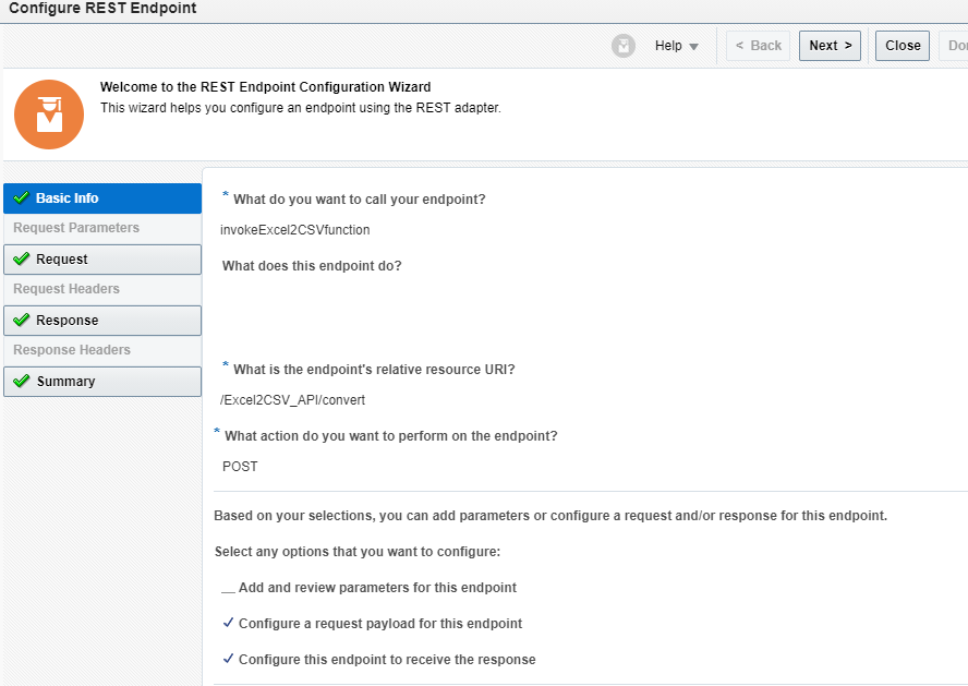 6. Invoke the API which exposes our Excel2CSV function. We do this via the REST connection we setup to the API Gateway. Ensure to specify the endpoints relative URI based on your implementation. See the configured request/response samples below: