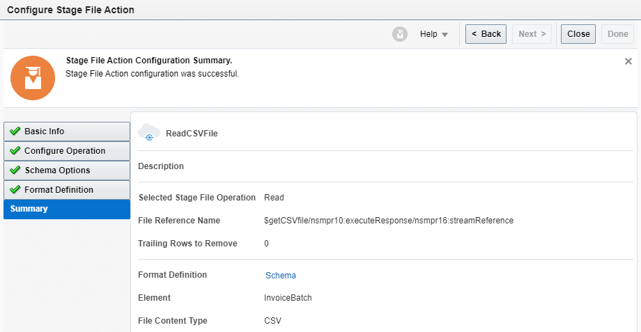 8. The ReadCSVfile step is responsible for reading the binary file and converting it to a native payload type for OIC. See the Github repository for a sample file if you are looking to construct this schema manually or just import the IAR.
