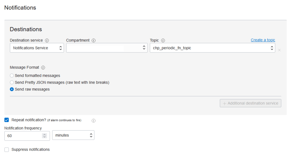 The final step, and the piece of configuration which enables this functionality is to add your Notification Topic as the Destination and configure how often you require your function to be invoked.