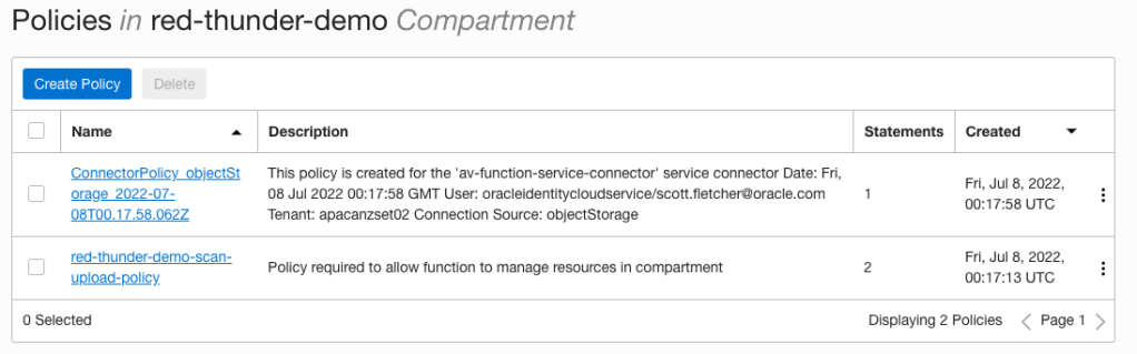 - “allow dynamic-group red-thunder-demo-scan-upload-dynamic-group to manage objects in compartment red-thunder-demo”. This allows the function defined by the Dynamic Group to manage Objects.