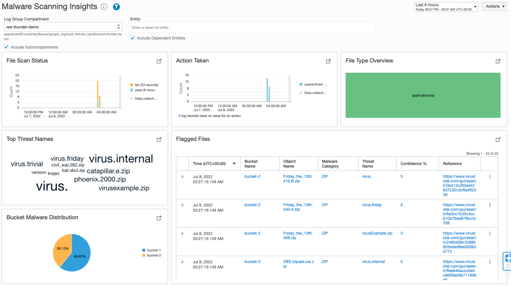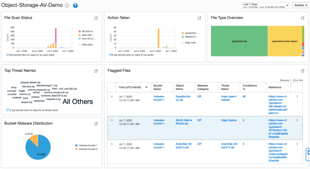 The Dashboard I’ve created shows some useful information, such as the volume of files scanned, the scan results, the actions taken, the threat names, in which buckets your malware is located, and information about the files flagged as malicious.