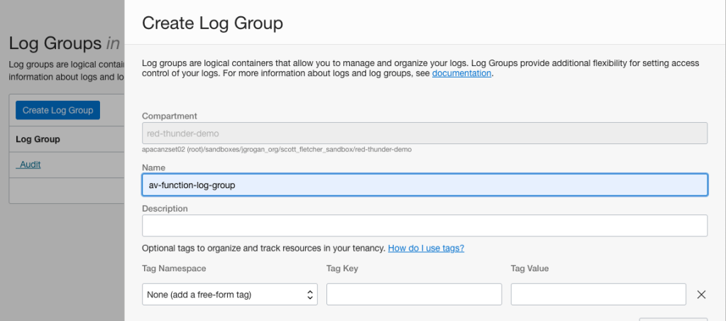 In Logging Analytics create a Log Group to hold our scan-results logs. I’ve called mine “malware-scan-results”: