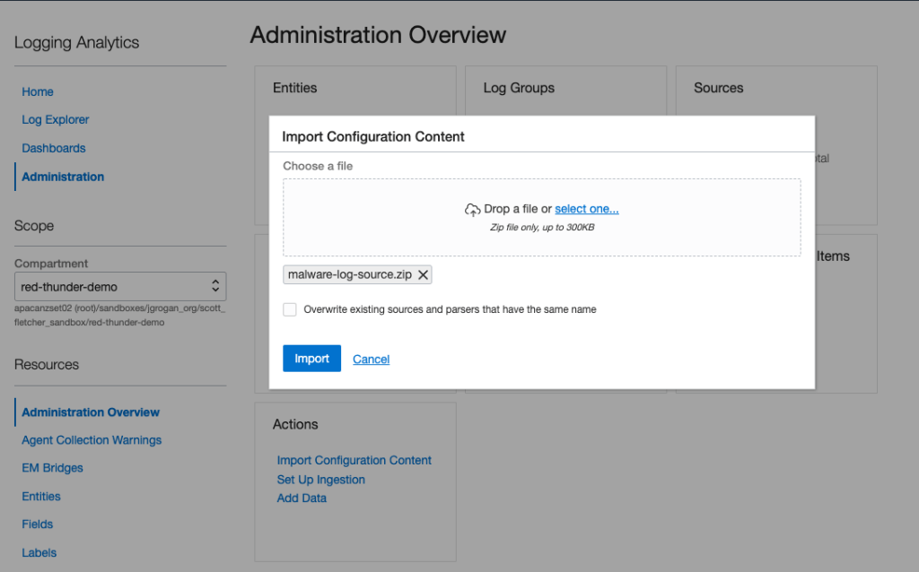 Download the Logging Analytics Log Source & Parser configuration if you haven’t retrieved it from GitHub https://github.com/scotti-fletcher/oci-av-function/blob/main/malware-log-source.zip