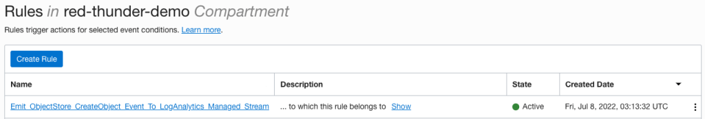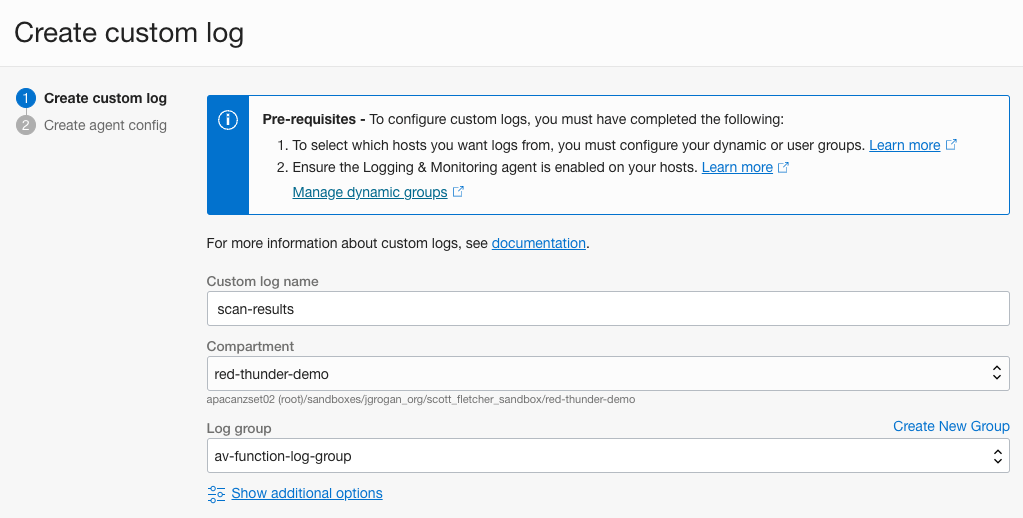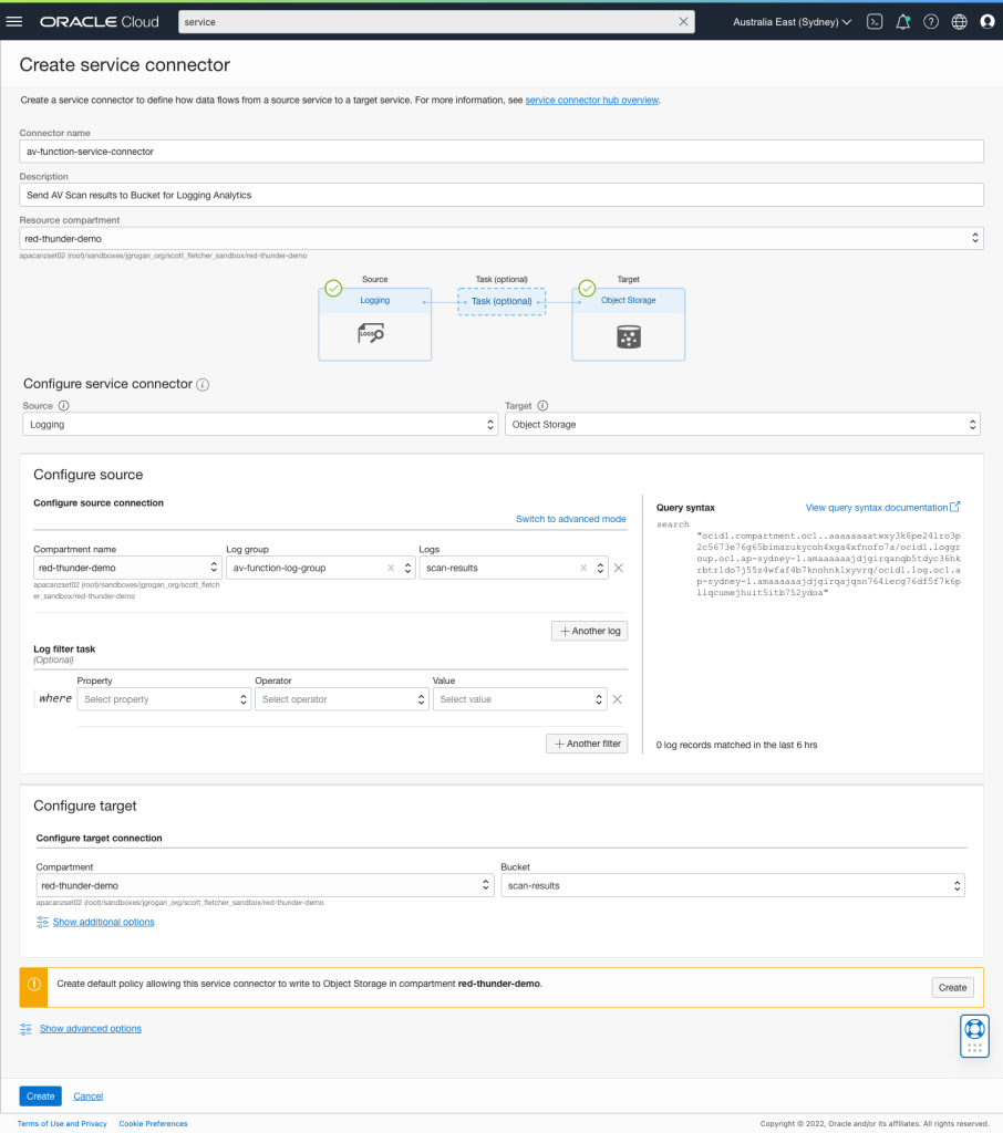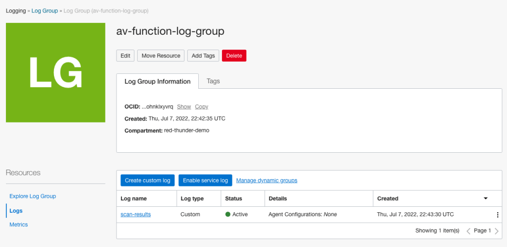 - “allow dynamic-group red-thunder-demo-scan-upload-dynamic-group to use log-content in compartment red-thunder-demo”. This allows the function to write to the custom log that we created to hold our scan results.
