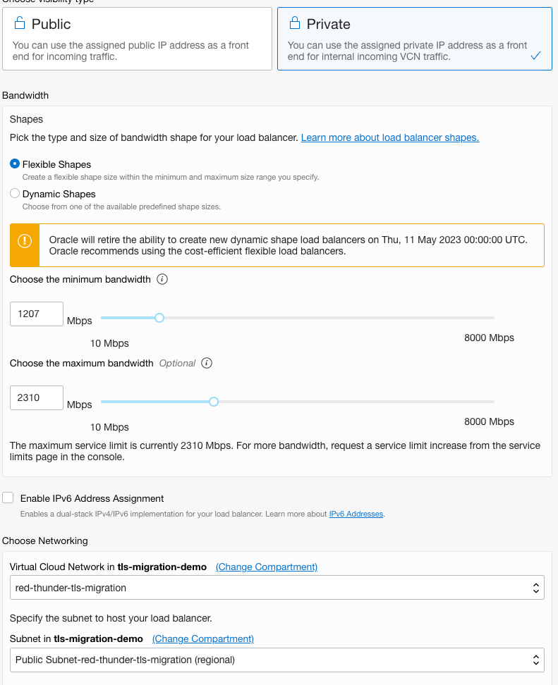 Now we want to create an OCI Load Balancer that we’ll use to proxy traffic between our OpenResty server, and our web server. Again ensure you select a shape that supports your expected network traffic: