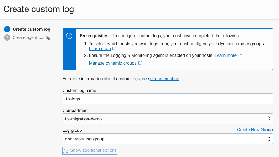 In Logging Analytics create a Log Group to hold our TLS logs. I’ve called mine “tls-logs”: