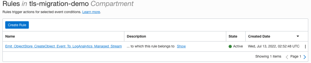 $ oci log-analytics object-collection-rule create --name tls-collection-rule --compartment-id [Your Compartment OCID] --os-namespace [Your Object Storage Namespace] --os-bucket-name openresty-logs --log-group-id [The OCID of the tls-logs Log Group] --log-source-name tls-migration-source --namespace-name [Your Object Storage Namespace] --collection-type HISTORIC_LIVE --poll-since BEGINNING