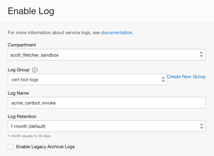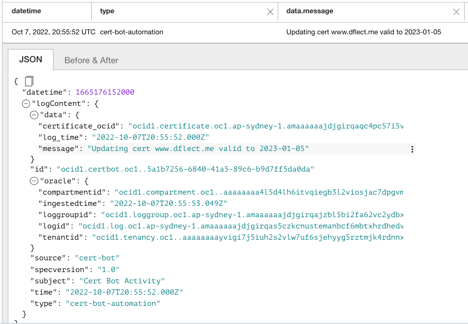 - OCI_LOG_OCID: This is the OCID of the cert-bot-activity-log you created earlier.