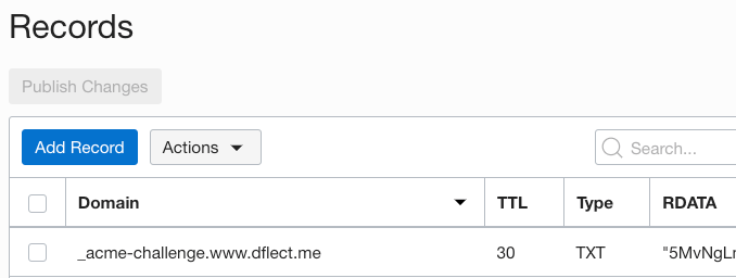 Looking at our DNS Zone records we can see a TXT record was added for _acme-challenge.www.dflect.me: