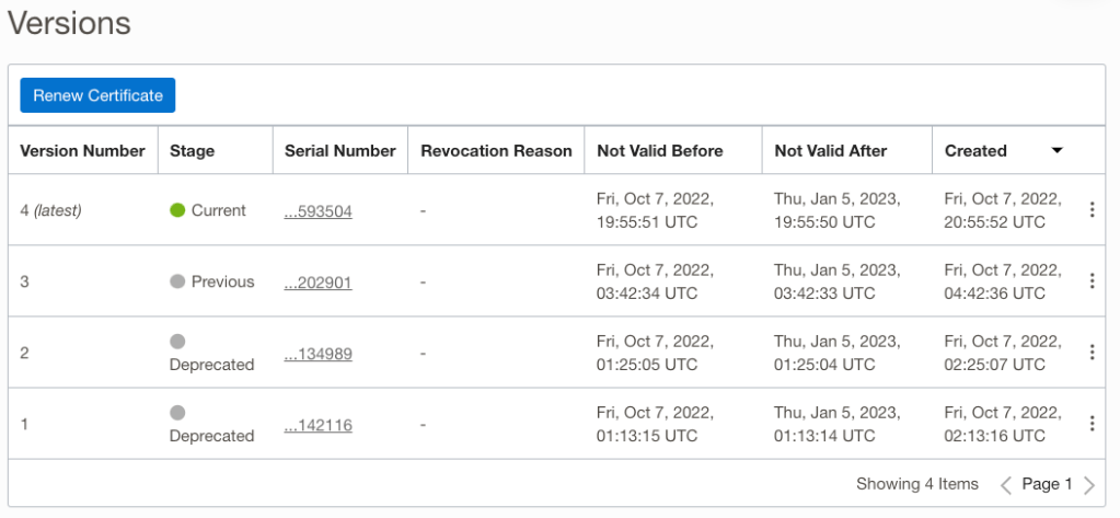 If we invoke the function again, we will see future certificates added to the existing certificate with the most recent promoted to the current version: