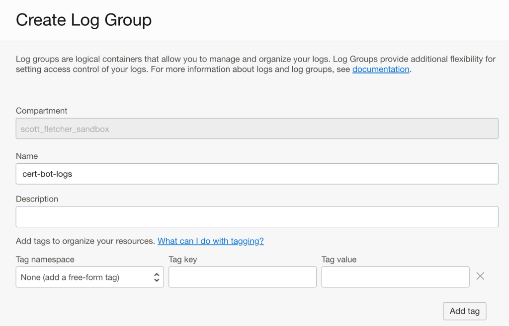 Also, where are you seeing the Log Groups authorisation error? This could be because the object doesn’t exist, or if it does (and you’re using the right OCID) that you don’t have the right permissions to access the it. For the later, what policies are assigned to your user in the compartment (or tenancy) that you’re trying to use?