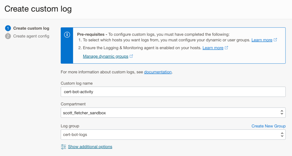 When prompted select “Add configuration later” and click create. You should see the log “cert-bot-activity” in the “cert-bot-logs”. Note down the OCID of the cert-bot-activity log as you will need this later.