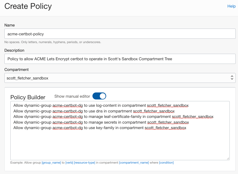 Allow dynamic-group acme-certbot-dg to manage leaf-certificate-family in compartment scott_fletcher_sandbox