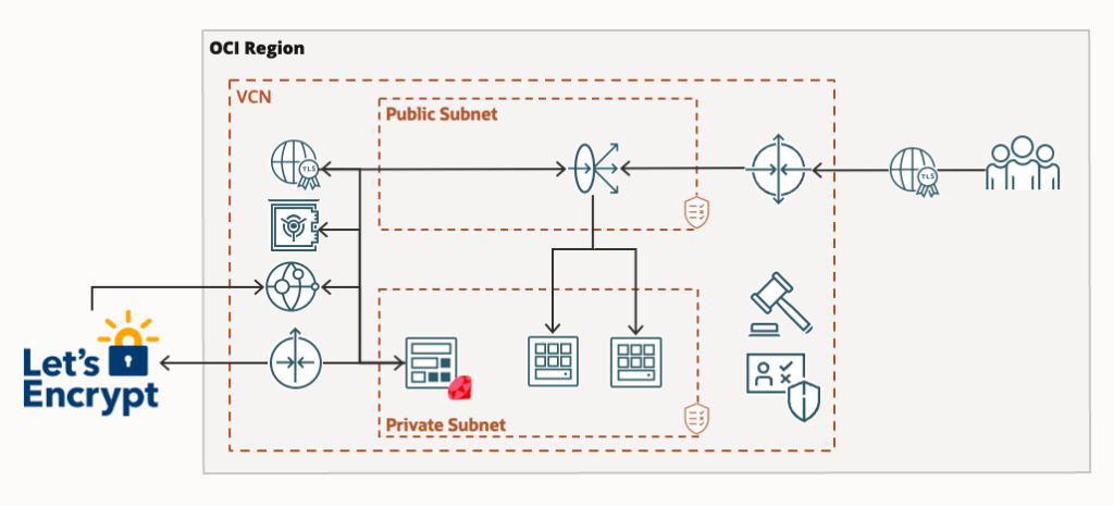 Handling certificates properly is just as important as enabling TLS on your endpoint. Certificates and private keys should always be stored securely and only accessible to authorised users and services. My solution uses OCI native services, Functions, DNS, Certificate Service, and Vault to perform the interactions with Let’s Encrypt and securely store certificate artefacts. All operations are performed in memory ensuring no certificates or keys are persisted to disk storage.