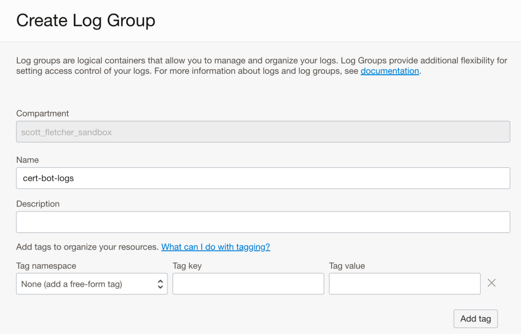 Now we need to create a Log Group to hold our Function specific logs. Create a log group, I’ve named mine “cert-bot-logs”: