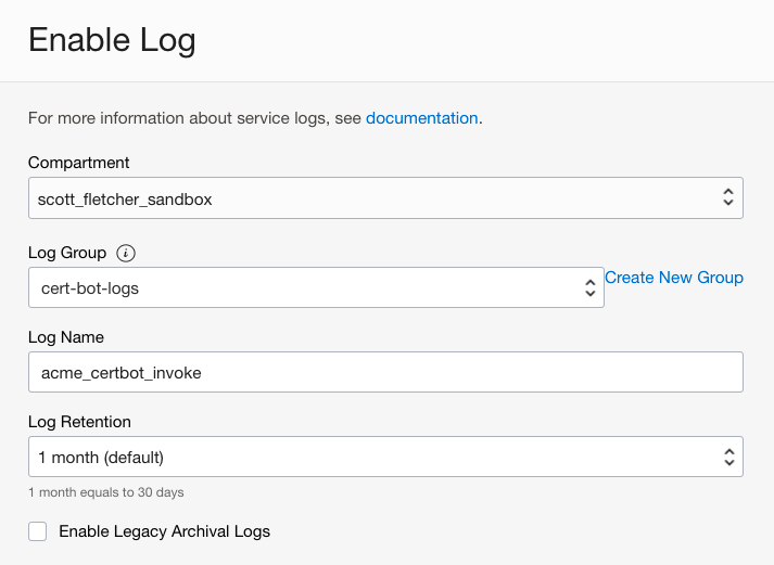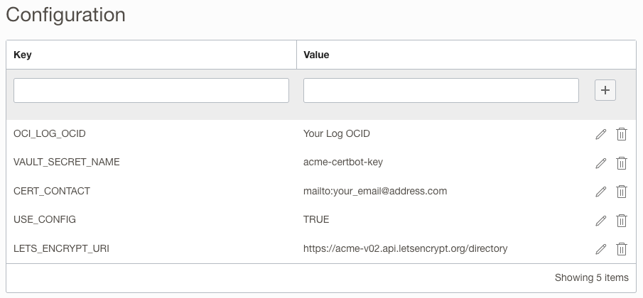 - OCI_LOG_OCID. This is the OCID of the cert-bot-activity-log you created earlier.