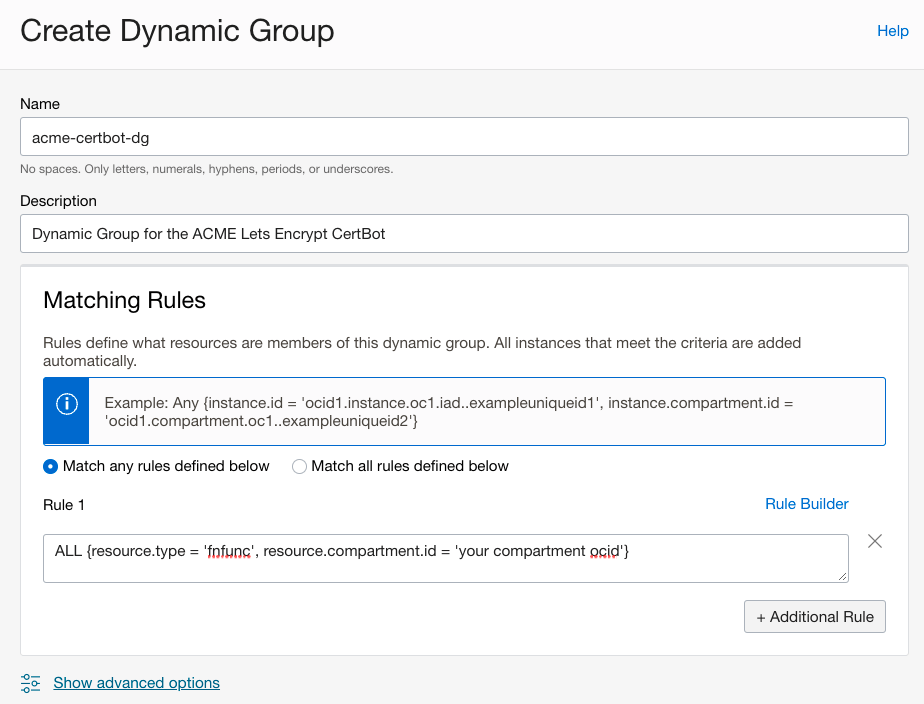 Before we test our function, we need to create a Dynamic Group, and Policies to allow our function to operate in our compartment. Depending on your use-case and in which compartments your Vault and DNS Zones reside you may need to adjust the policies. My examples below are scoped to my sandbox compartment.