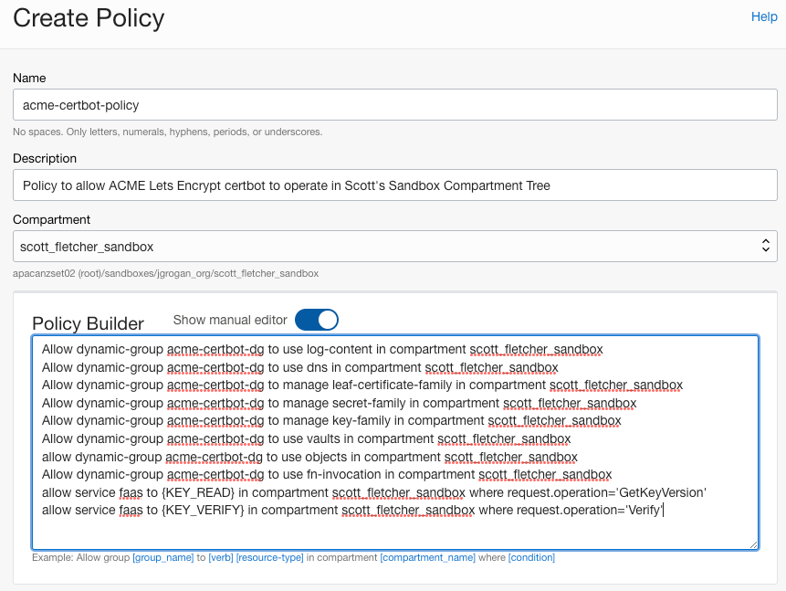 Allow dynamic-group acme-certbot-dg to manage key-family in compartment scott_fletcher_sandbox