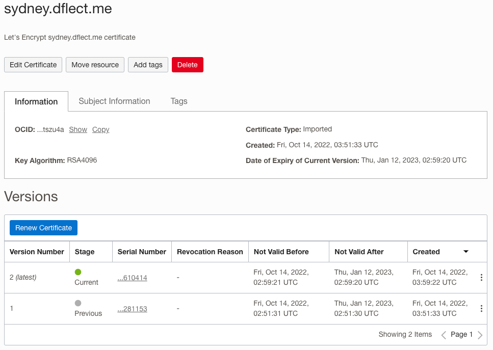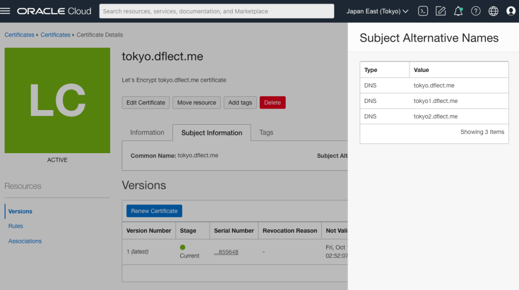 In my config file I’ve configured two certificates to be managed, one using my vault in Sydney and one using the one vault in Tokyo. As my dflect.me DNS zone home region is Sydney, “dns_region”: “ap-sydney-1” is present in both configurations. You will also need to configure: