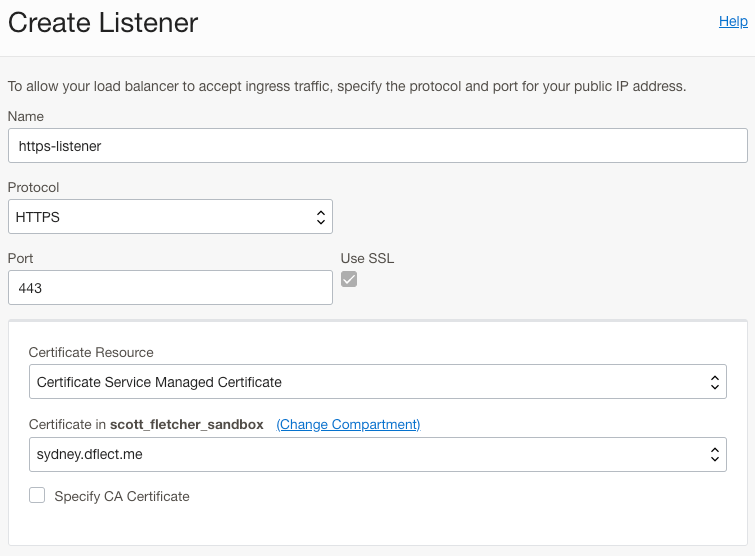 Now we need to associate the certificates with their respective Load Balancer listeners. You can create a HTTPS listener, or edit an existing listener. Select the certificate that has been created:
