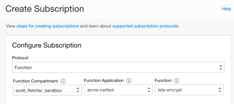 After creating a topic, create a subscription that will call our lets-encrypt function: