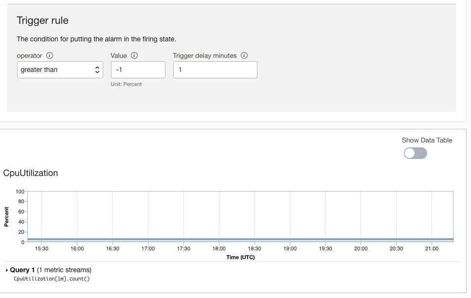 Trigger the rule for when the value is greater than -1, meaning the alarm will always fire. You may need to enter 1, then press the down arrow key to get to the value of -1. You can validate the metric will work by looking at the graph. The blue line indicates the metric will fire the alarm: