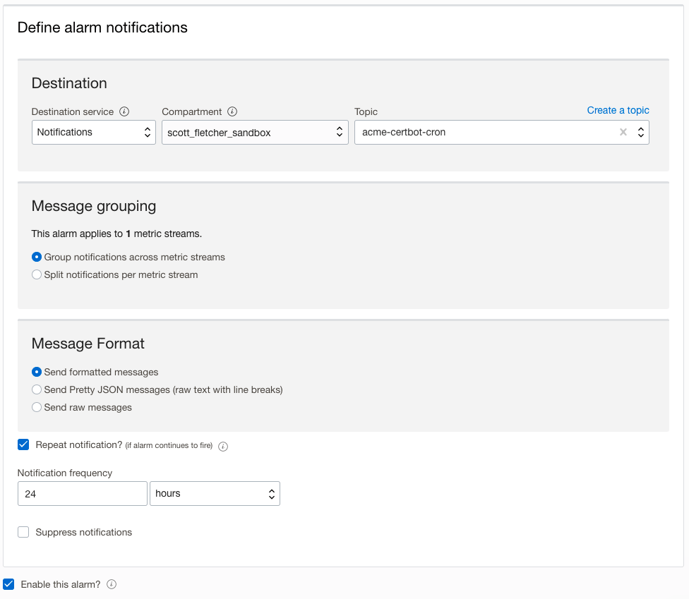 Now all we need to do is configure the alarm to send a message to our notification topic. Note I have configured the alarm to repeat the notification every 24 hours. This will ensure our lets-encrypt function runs once a day: