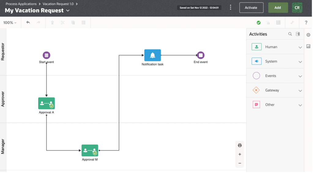Just to simplify the explanation, I will describe a “happy path” process … in my example building one business process which usually is quite loved by everyone…. mainly when talking about the Vacation Request Approvals 🙂