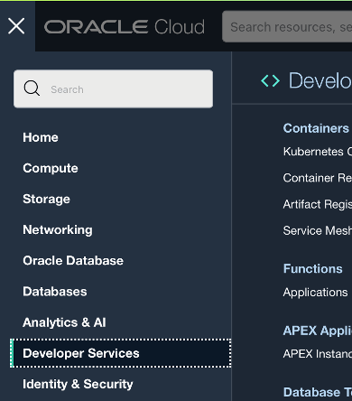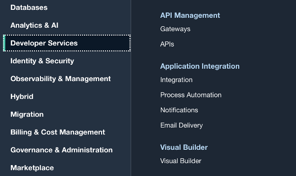 We can start from the provisioning. If you go to the OCI Console we can easily find the Oracle Process Automation link in the Developer Services section how below include in the picture