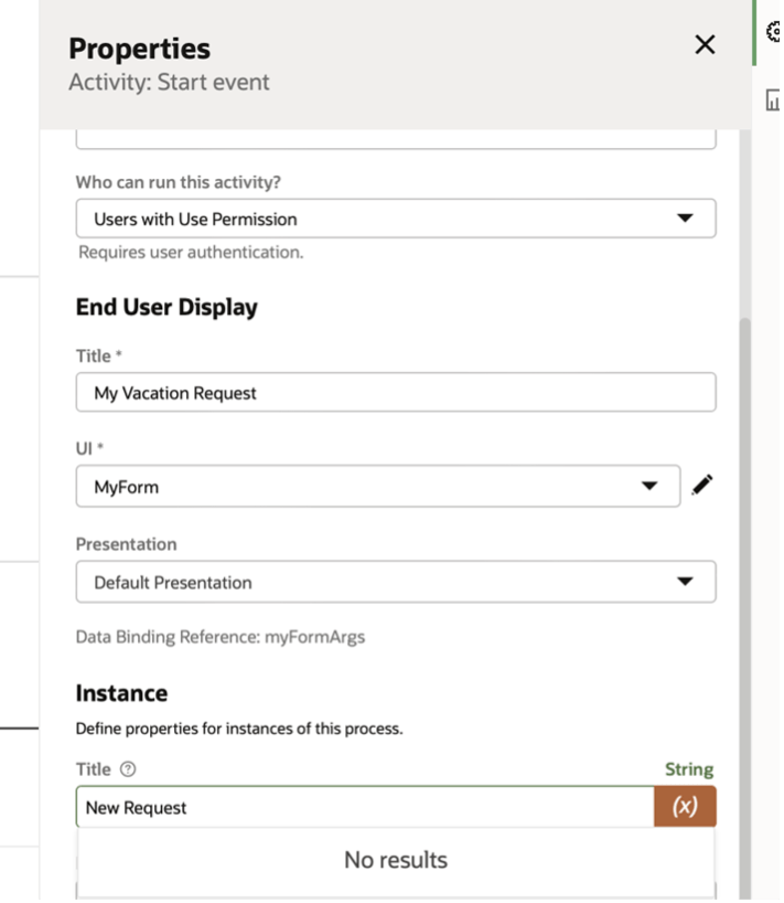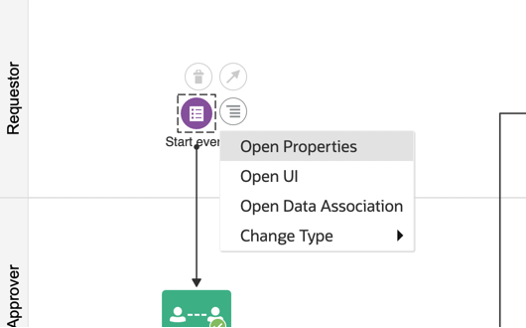 Now going back to our BPMN representation, we can click on each activity (start event, Approval A and Approval M) selecting “open properties” and configuring the missing info about “title” and “web form” to be used by the end user. “MyForm” is that one just built for this purpose