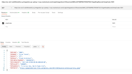 Inside the postman, set basic auth to your OIC credentials and pass empCode as query parameter and test the result