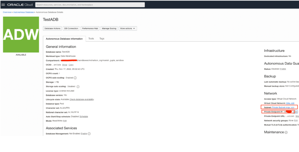 Once ADB gets created you will see similar screenshot. Note down the IP address of service and make sure you have installed this in private subnet.