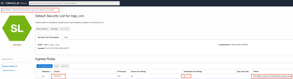 Please note that the connectivity agent compute is in private subnet, so you won’t be able to SSH on this until you allow ingress security rule for port 22 from Public subnet Bastion/Jump host Compute.