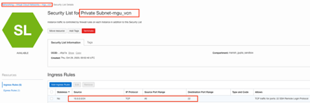 Source Type- CIDR, Source CIDR – Your public subnet range e.g. 10.x.x.0/24, IP Protocol – TCP, Source Port Range – ALL, Destination Port Range 22, Description – Allow traffic from Bastion/Jump Host server to OIC Connectivity agent compute over SSH port 22.