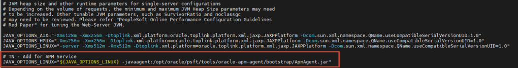 JAVA_OPTIONS_LINUX="${JAVA_OPTIONS_LINUX} -javaagent:/opt/oracle/psft/tools/oracle-apm-agent/bootstrap/ApmAgent.jar"