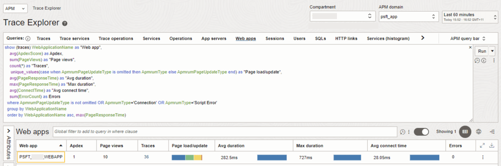The OCI Application Performance Monitoring (APM) service enables administrators to monitor and observe the PeopleSoft web applications.