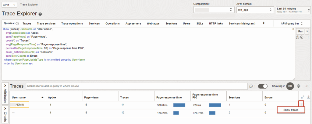 Confirm the APM End User Session along with Username captured for PeopleSoft is now collecting and is visible in APM Trace Explorer.