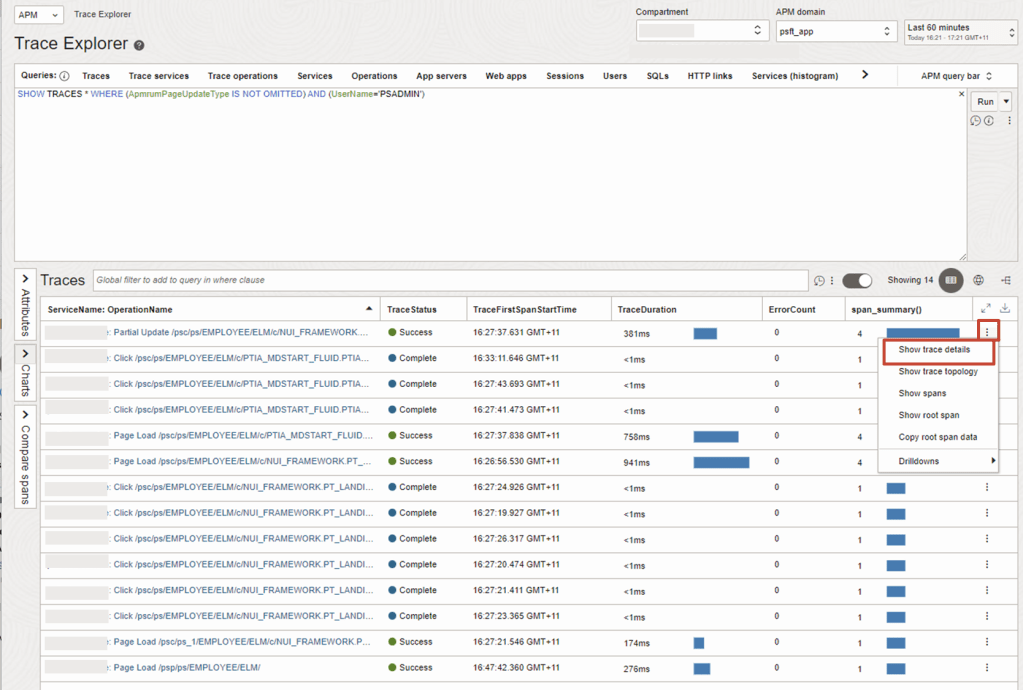 Confirm the APM Server Traces for PeopleSoft is now collecting and is visible in APM Trace Explorer