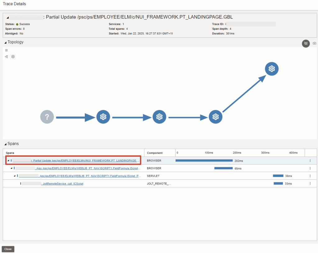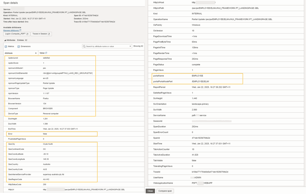 - Specific PeopleSoft Application attributes eg. PortalName, PortalPortalNodePart to help identify the Application Portal the end user is trying to access. There are many other EBS attributes collected by default which are unique to OCI APM service. For further information of these EBS attributes that are collected, please refer to Oracle E-Business Suite Dimensions in the documentation.