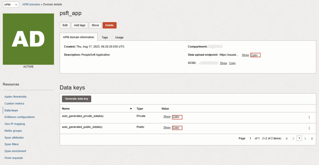 OBSERVABILITY & MANAGEMENT > APPLICATION PERFORMANCE MONITORING > ADMINISTRATION > APM DOMAINS > [Select APM Domain eg. psft_app ] > DATA KEYS