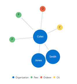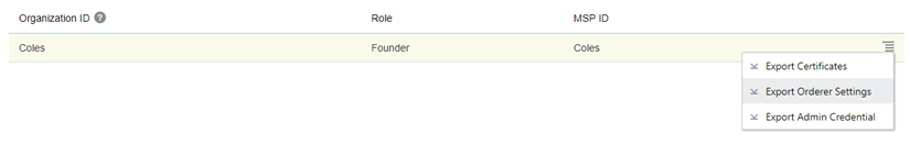 We’ll click on the link for the network (and in this case it’s Coles) and this opens a new console for managing the Blockchain network. Under the Network tab, the different organisations exist. The Orderer settings are extracted to be shared with the participant organisations. This process downloads a JSON file with some configuration.