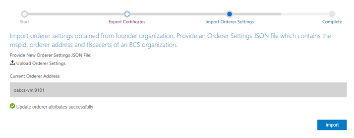 Here’s a screenshot of the workflow to export the certificates which exports a JSON file and import the Orderer settings.