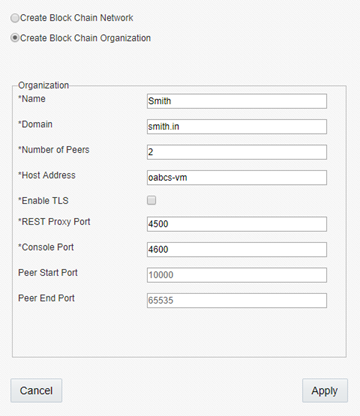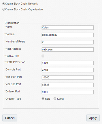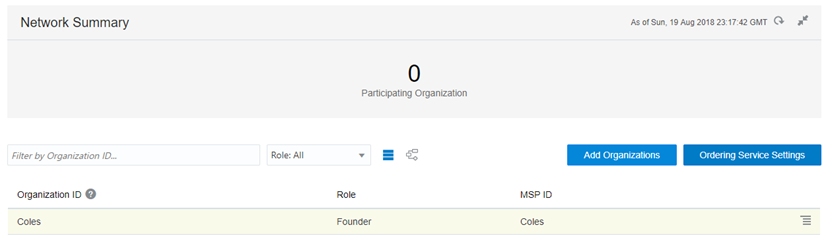 For this example, I created one network and two organisations. That’s the first thing that I did. What happens is that the different blockchain services are provisioned for the network and organisations. In the default configuration, there’s a Blockchain Management console started to manage the network and organisations. This in default scenarios is deployed on port 3000 so go to http://<host>:3000.