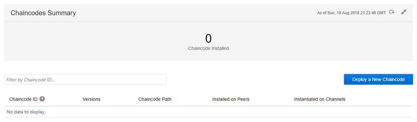 We navigate to the Chaincode tab in the Blockchain Network console. This is where we see the different chaincodes deployed including different versions.