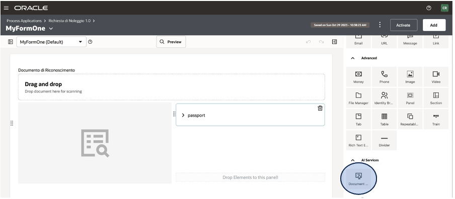 As you can see below, when you design your WebForm from OCI OPA Console you can find on the right side, included in the activities section, the new icon about the AI Document Understanding.