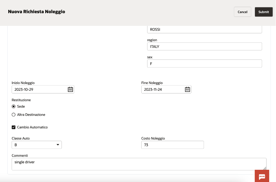 Once the operator has identified the right process, clicking on the “Nuova Richiesta di Noleggio”, the webform appears to accept the required info.