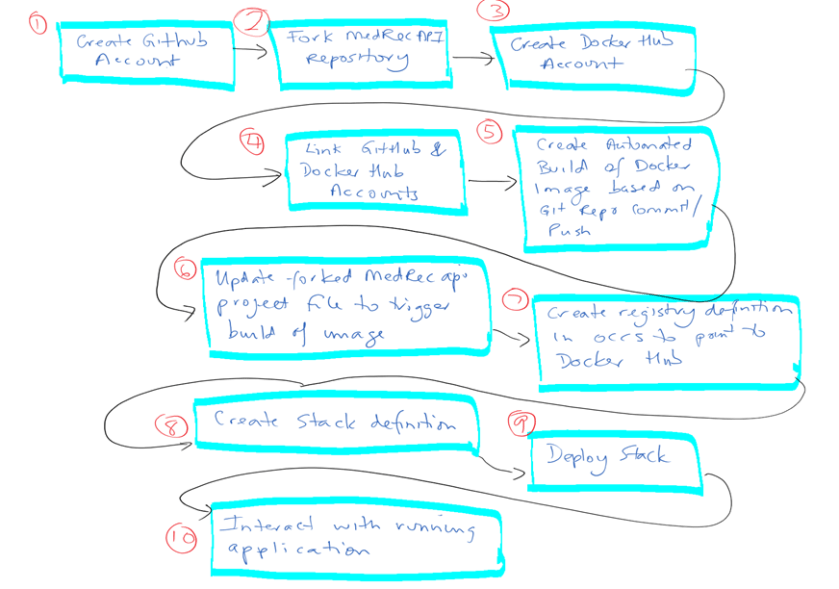 In this blog I wanted to do something similar but this time focus on a more simplified process so that a less technical user could follow the steps without the need for a development environment. The way I have structured this post mans that you can follow every step using a web browser. I have attempted to focus more on consuming the dockerised application that a developer has already built. For the purpose of this exercise I am using the example Medical Records application that some of you may be familiar with from some of my previous blog posts. For those not familiar with the application, it consists of a Node.js web application that interacts with a MongoDB database. The web application surfaces a number of REST APIs (eg Get / POST Patient , GET / POST Physician, GET/POST Observations etc), and uses Swagger UI so that the REST APIs can be quickly interacted with by the end user.