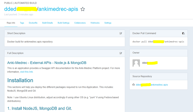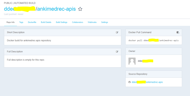 In the Create Automated Build page you can specify a repository name for docker image but I suggest that you accept the default repository name so that it matches the Github repository name. You can enter a description such as … “Docker build for ankimedrec-apis repository.”